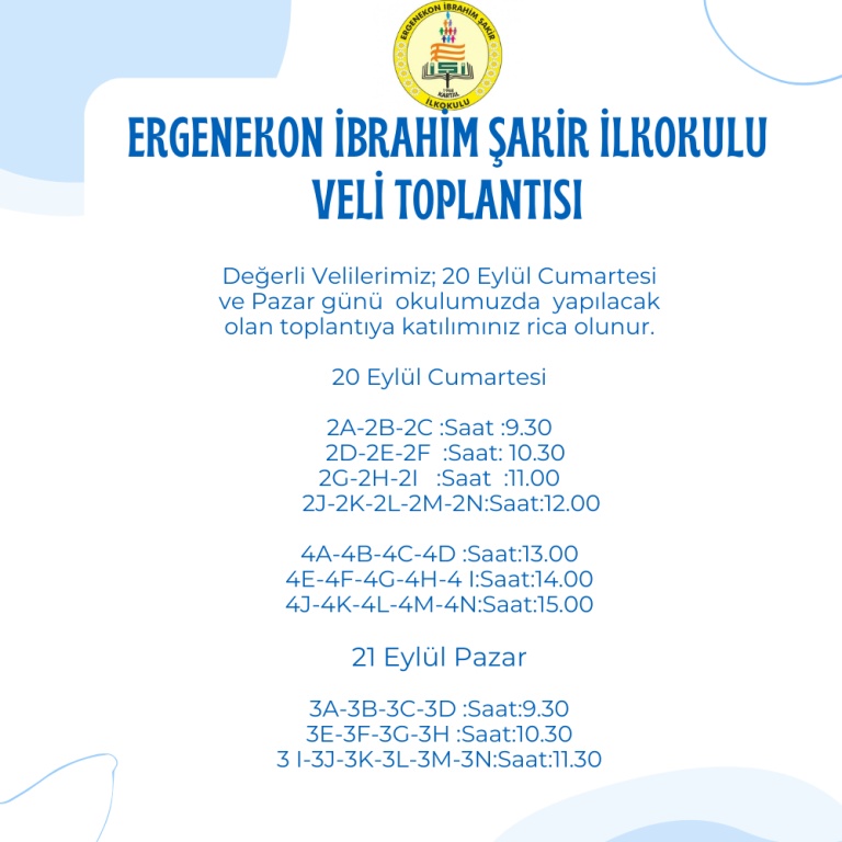 Değerli Velilerimiz; 20 Eylül 2025 Cumartesi ve Pazar günü okulumuzda yapılacak olan toplantıya katılımınız rica olunur.